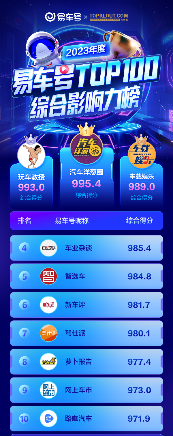 其中“2023年度易车号TOP 100综合影响力榜”由易车与克劳锐联合发布。它是依托于易车大数据,对入驻易车号创作者发布的影响力指数进行排名,由质量分、消费分、互动分、消费分等算法加权得出,体现易车号创作者内容优质程度、赋能创作者商业价值。