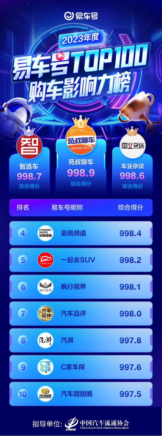 另一份榜单“2023年度易车号TOP 100购车影响力榜”是在中国汽车流通协会指导下由易车公布。“购车影响力榜”是基于用户消费、用户选车行为分析内容质量、流量等因素甄选易车号优质创作者进行动态排名,并通过榜单的公正排名,为内容创作者提供真正面向用户的优质内容生产方向,加强优质内容创作者与用户的联系,帮助内容创作者创作更有价值的内容。同时,榜单也为购车用户了解车型、制定购买决策提供更高效和有价值的参考。
