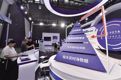 图为2023中国国际数字经济博览会上,北京晟通兆合科技有限公司工作人员(左二)向参观者介绍极限超算系统。 记者 骆学峰 摄