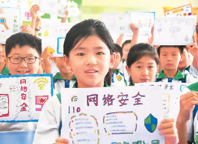 河北省邯郸市永年区洺州小学的孩子们展示网络安全手抄报。