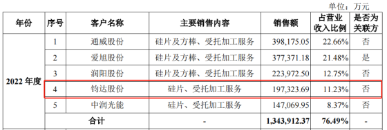 例如,2022年,高景太阳能作为钧达股份的第2大供应商,其采购金额为17.86亿元,而在高景太阳能的招股书中,钧达股份作为其第4大客户,销售额为19.73亿元。两者公布的数据相差近2亿元。