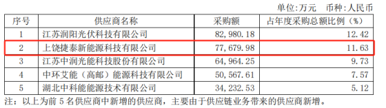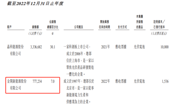 在2021-2022年,晶科能源都是钧达股份的第1大供应商,采购金额分别为4.30亿元和20.06亿元。尤其是2022年,按照上述采购金额计算,钧达股份可以成为晶科能源前5大客户之一。然而,晶科能源2022年报显示,公司前5大客户的销售额并未有与钧达股份采购金额相一致的数据。