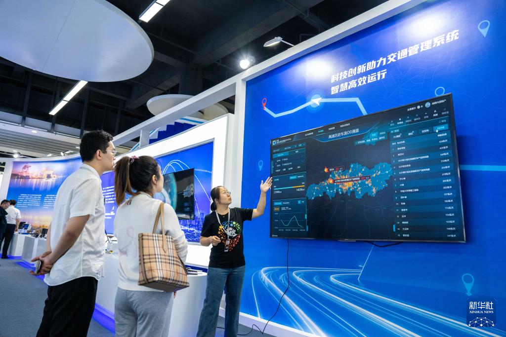 工作人员向观众介绍北斗技术在交通管理系统中的应用。新华社记者 陈思汗 摄