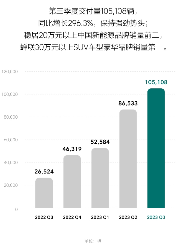“今年第三季度,面对强劲的市场需求,我们不断提升产供销协同能力及生产能力,在交付表现上实现多项突破,成为首家达成50万辆累计交付里程碑的中国新势力车企。理想L系列的三款车型从八月开始连续三个月单车交付均突破万辆,帮助理想汽车蝉联中国30万元以上的SUV和新能源汽车销量冠军。”理想汽车董事长兼首席执行官李想表示。