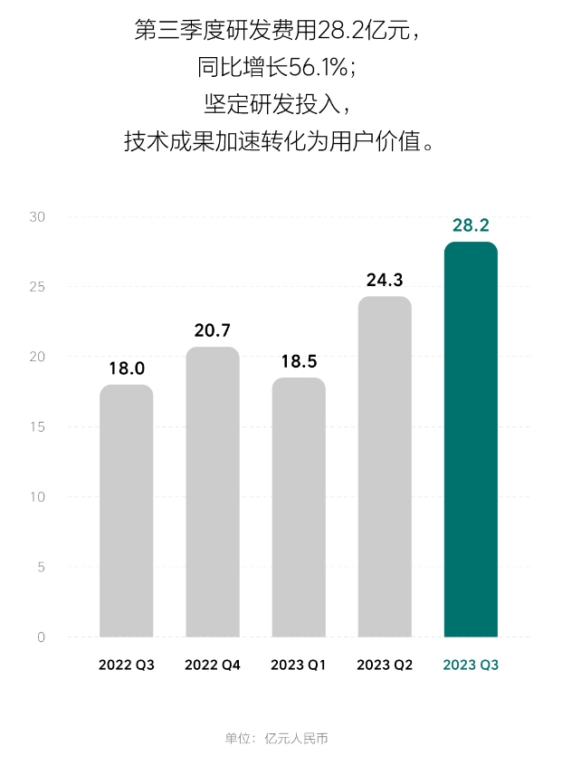 理想在研发方面一直比较舍得投入,其第三季度的研发费用为人民币28.2亿元,同比增长56.1%,较2023年第二季度的人民币24.3亿元增加16.1%。理想汽车表示,研发费用的增长主要事故由于雇员数量增加导致雇员薪酬的增加,以及用于支持公司不断扩展的产品组合及技术的开支增加。