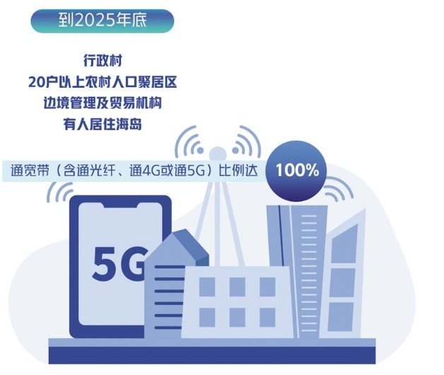 在乡村层面,要促进边疆地区乡镇政府驻地、行政村宽带向千兆光网升级,灵活采用中频和低频5G基站,逐步推进5G网络向农村地区延伸覆盖。探索偏远地区分散用户宽带接入技术和组网方案,加快推进20户以上农村人口聚居区、抵边新村、林场/农场/牧场驻地等场景宽带网络覆盖。